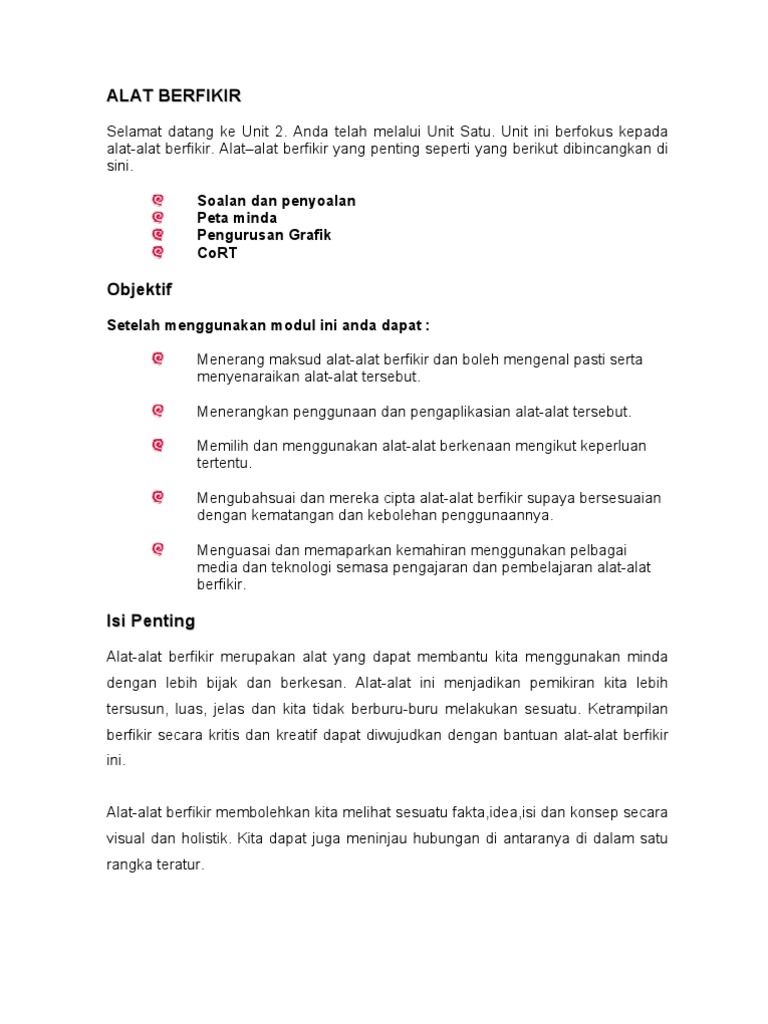 Check more flip ebooks related to alat-alat berfikir CoRT 1 of BM50621 Nooranis Najwa Binti Ariff. Check spelling or type a new query. Strategi terakhir dalam mengajar pelajar untuk berfikir secara KBAT adalah dengan menggunakan alat berfikir.
